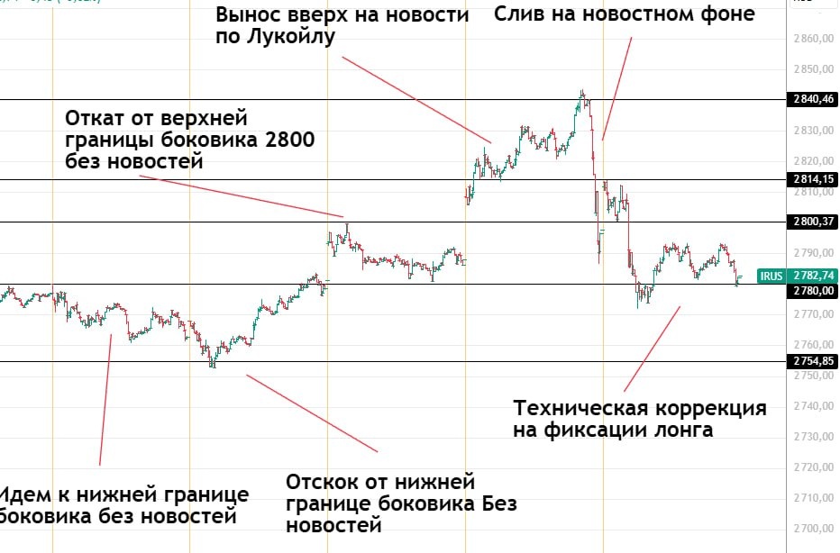 : ⏺Друзья, решил не записывать обзор тк как не вижу смысла целый час гонять воздух. ⏺Рынок остается новостным на 100%, ключевое событие которое ждал рынок будет завтра и итог этого события определит дальнейшее движение рынка, поэтому сейчас пытаться что то анализировать на перспективу это пальцем в небо. __ Просто давайте разберем прошедшую неделю на графике ММВБ чтобы было понимание: ⏺Мы понимаем что рынок находится в ожидании переговоров и ЛОГИЧНО предполагать что не зная итогов переговоров врятли кто то БЕЗ НОВЫХ ФАКТОРОВ будет делать какие то движения именно в долгую. ⏺НЕ логично покупать на всю котлету перед переговорами исход которых ты не знаешь ⏺НЕ логично вставать в шорт на всю котлету по той же причине. ⏺Соответственно мы с Вами понимаем что ТОЛЬКО НОВЫЕ новости могут стать драйвером движения. ⏺Так же мы понимаем если новостей нет, мы будем болтаться в боковике с чисто спекулятивными движениями. ПН - НЕТ новостей, мы сползаем к нижней границе боковика 2750. ВТ - НЕТ новос