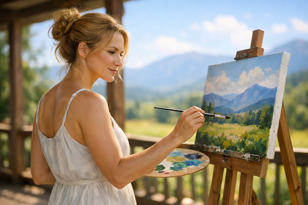 Вернулась к мольберту. Взяла кисть. Первый мазок. Второй. Синяя краска легла на бумагу. Потом зеленая. Белая. Желтая.