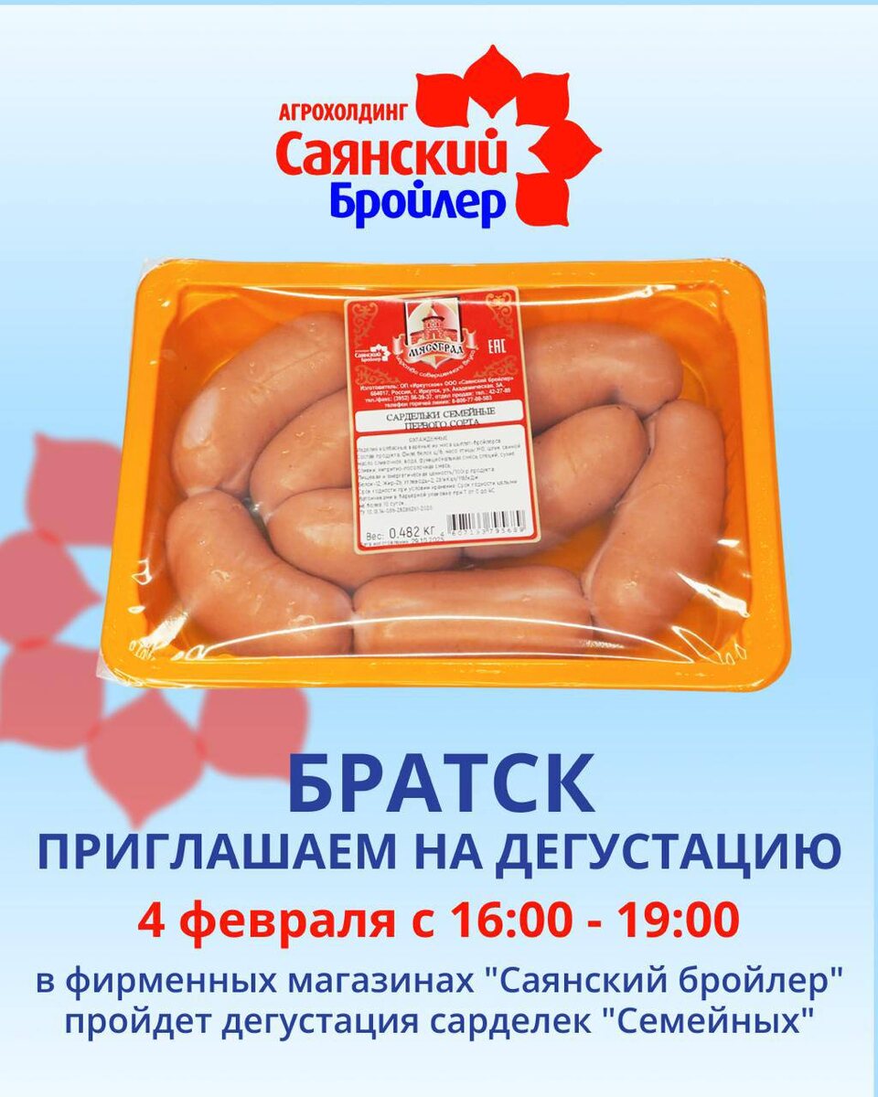 » 🗓 4 февраля ⏰ с 16:00 до 19:00 📍 г. Братск, фирменные магазины «Саянский Бройлер» Приходите попробовать нашу новинку и оценить вкус лично. Сардельки «Семейные» — это: — нежная текстура и мягкий сливочный вкус (в составе — сливочное масло); — универсальный вариант для семейных завтраков, ужинов и быстрых перекусов. Будем рады видеть вас на дегустации! Приходите, пробуйте и делитесь впечатлениями 🤍