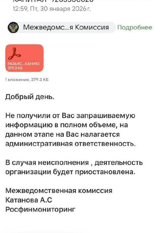! Появилась новая рассылка с «административным взысканием от Росфинмониторинга». Это подделка! Не переходите по QR‑коду и не открывайте вложения — так злоумышленники пытаются получить ваши данные. Росфинмониторинг не направляет подобные уведомления через СМС или электронную почту.