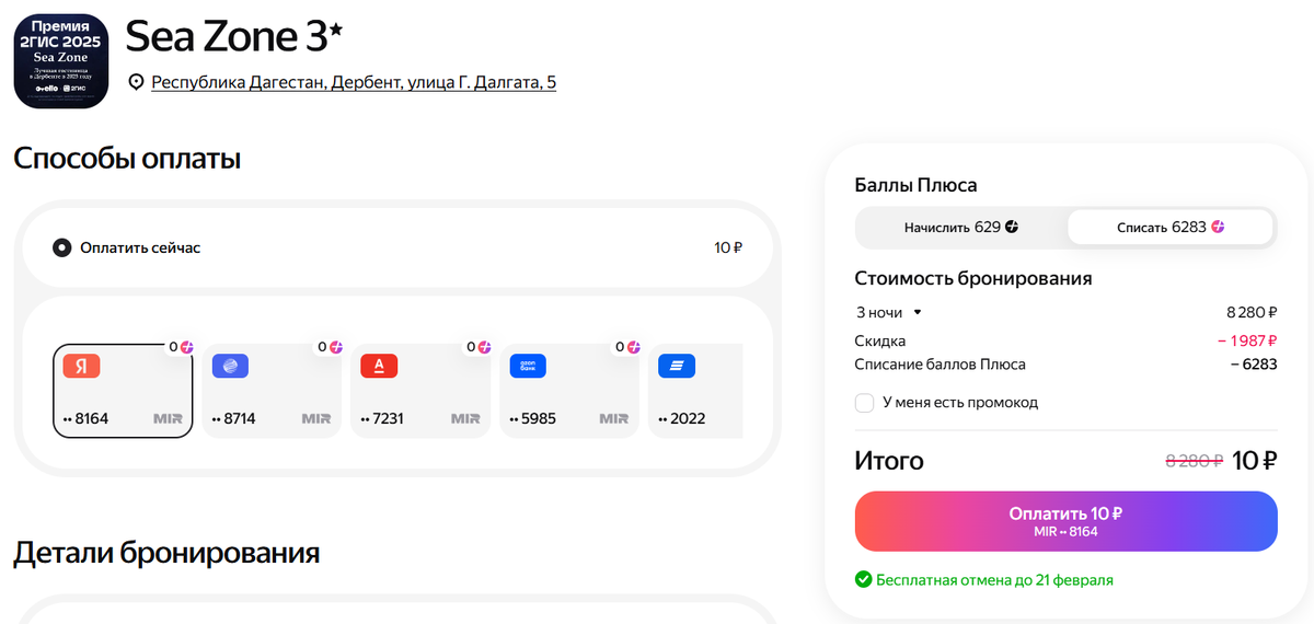 Забронировал отель в 150 метрах от моря и с видом на море, заплатив всего 10 рублей. Рассказываю как так получилось. На самом деле всё просто. Я коплю баллы "Яндекс Плюса", пользуясь картой Пэй и получая эти самые баллы кэшбеком. Когда накапливается необходимая сумма и впереди туристическая поездка, то бронирую отель в сервисе "Яндекс Путешествия", а там можно списать баллы до 100% (надо только оплатить 10 рублей). Как видно на скрине, сервис даёт списать полную стоимость гостиницы. А если у вас есть ещё и промокод, то будет дополнительная скидка. Скидка 600 ₽ на бронирование отеля на Яндекс Путешествиях по промокоду FORMYFRIEND-IQG7V9QT Вот так три ночи в отеле в Дербенте обошлись мне практически бесплатно. Пользуйтесь!