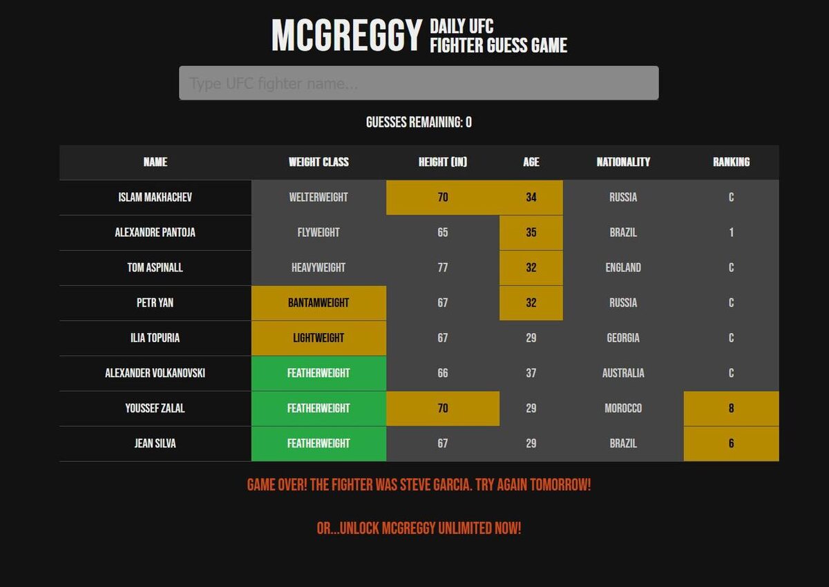 ! 📊Вы уверены, что сможете узнать Алекса Волкановски из тысячи? Знаете, какой рост у Моралеса и сколько лет Шаре Буллету? Тогда сайт Mcgreggy, конечно же ни в коем случае не связанный с одним известным ирландцем, для вас! 🔝Игра довольно простая – каждый день организаторы загадывают бойца UFC, а нам нужно за 8 попыток и 5 показателей его отгадать. Зеленое: полное совпадение, желтое: мы в паре-тройке пунктов от истины, серое: полный промах. Если хочется сыграть больше, чем один раз в день, то нужно платить. Также можно попробовать увеличить уровень сложности, замахнувшись на женскую сторону UFC. ❓Угадали сегодняшнего парня, эксперты в мире ММА?