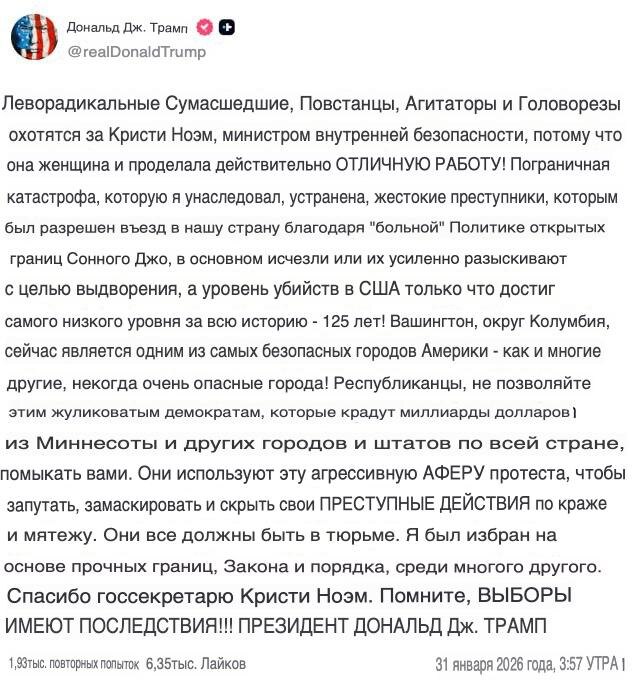 📸 Дональд Трамп встал на защиту министра внутренней безопасности Кристи Ноэм на фоне продолжающихся протестов.