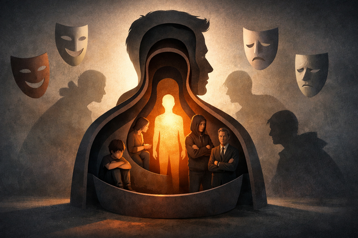 У людей с относительно теплой, безопасной историей эти состояния перетекают одно в другое без швов. Сегодня ты - партнер, завтра - сотрудник, послезавтра - сын или дочь, и нигде не возникает ощущения: "это не я". Но в терапии часто видно другое: внутренняя карта дробится на части, которые как будто живут в разном времени. Внутри может сидеть пятилетний "я", подросток, который до сих пор кипит от несправедливости, и совсем маленький комочек страха, который слов не знает, но отлично умеет сжимать горло.