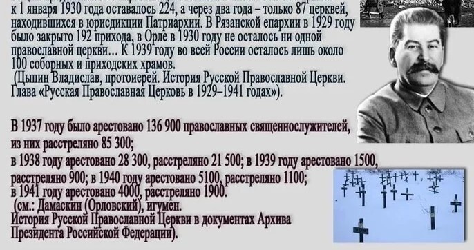 Эту картинку об ужасах сталинской эпохи я увидел здесь, на Пикабу. Правда, кошмар? А теперь посмотрим, что нам говорит дореволюционная статистика. Например: А на 1915 год на всей территории Российской империи проживало 112 629 человек духовенства! Священников из них было около 50 тысяч. Всего. - При этом после революции немало представителей духовенства сбежали с белыми за границу. - Была естественная убыль по болезни и старости. Это около 2 процентов в год. - За пределами СССР осталось православное духовенство Польши, Финляндии, Прибалтики, Бессарабии, Волыни, Западной Белоруссии. - Наконец, немало священников бросило службу в РПЦ, разочаровавшись в религии. Новичков, желающих служить РПЦ, после 1917 года было немного. Перепись населения СССР, проводившаяся в конце 1926 года, показала, что в этот момент численность православного духовенства сократилась примерно в два раза. Да, репрессии против РПЦ были, она ведь выступила против власти. (Которая всегда вроде как «от Бога»). В любой ст