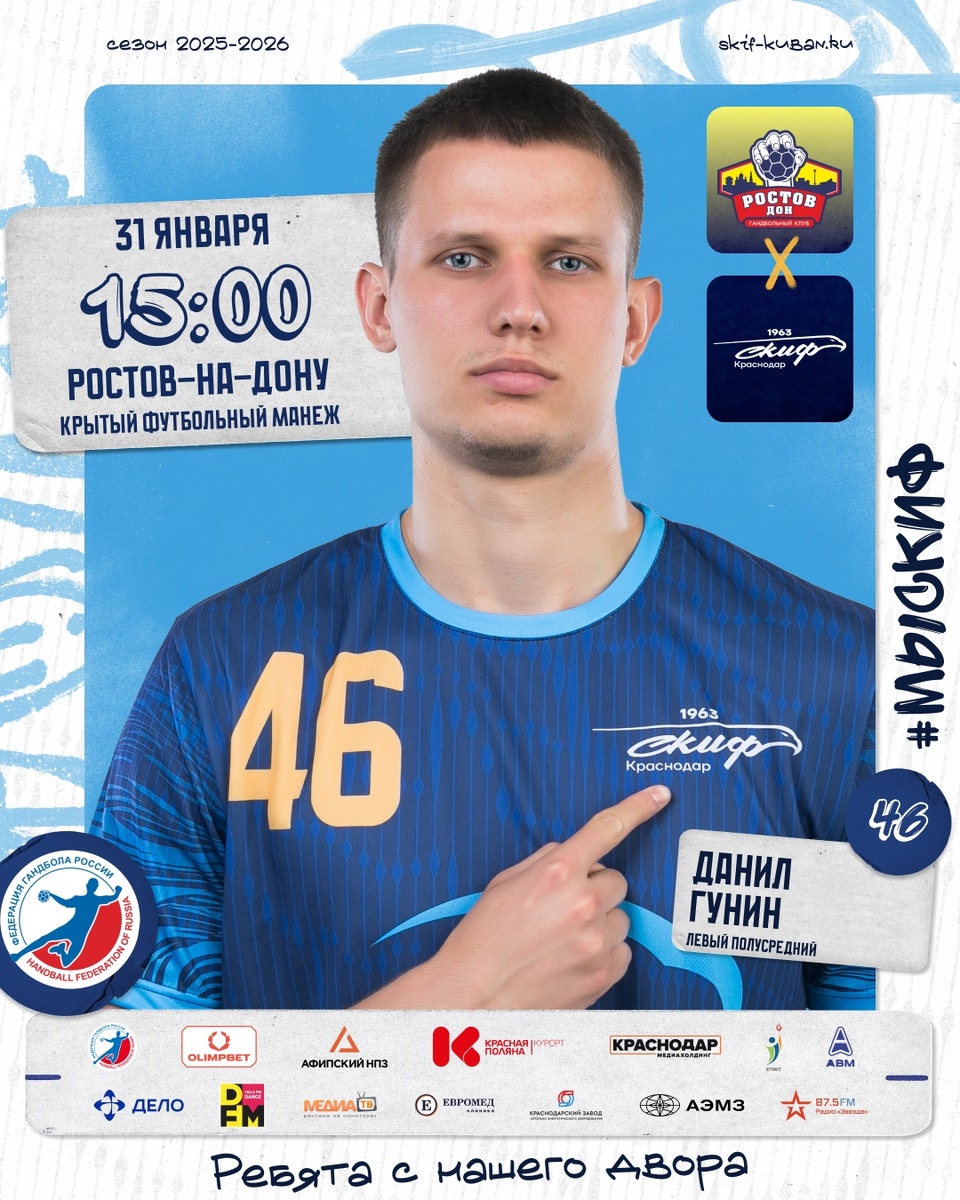 Сегодня в игровой программе Кубка России одним матч. "Ростов-Дон", представляющий высшую лигу, встретится с клубом Суперлиги краснодарским СКИФом. 31 января 1/4 финала Первый матч Ростов-Дон - СКИФ - 15.00 (мск) Ростов-Дон: Ледяев, Шимоенков; Д.Воробьёв, Васильев, Палишев, Татаринцев, Ковалёв, Самойленко, Сибирёв, Самарский, Трофимец, Арзамасов, Лысенко, Востриков, Пихтярев, Секерич. СКИФ: Кондратенко, Крикунов; Шалабанов, Утка, Долинин, Шайдука, Жук, Иванников, Пасенов, Головня, Чан Суан Вьет, Кашников, Гунин, Эстеки, Чернов, Осадчий. Ответный матч - 7 февраля Прямые трансляции матчей доступны на портале "Гандбол ТВ" Фото: vk.com/skifhandball