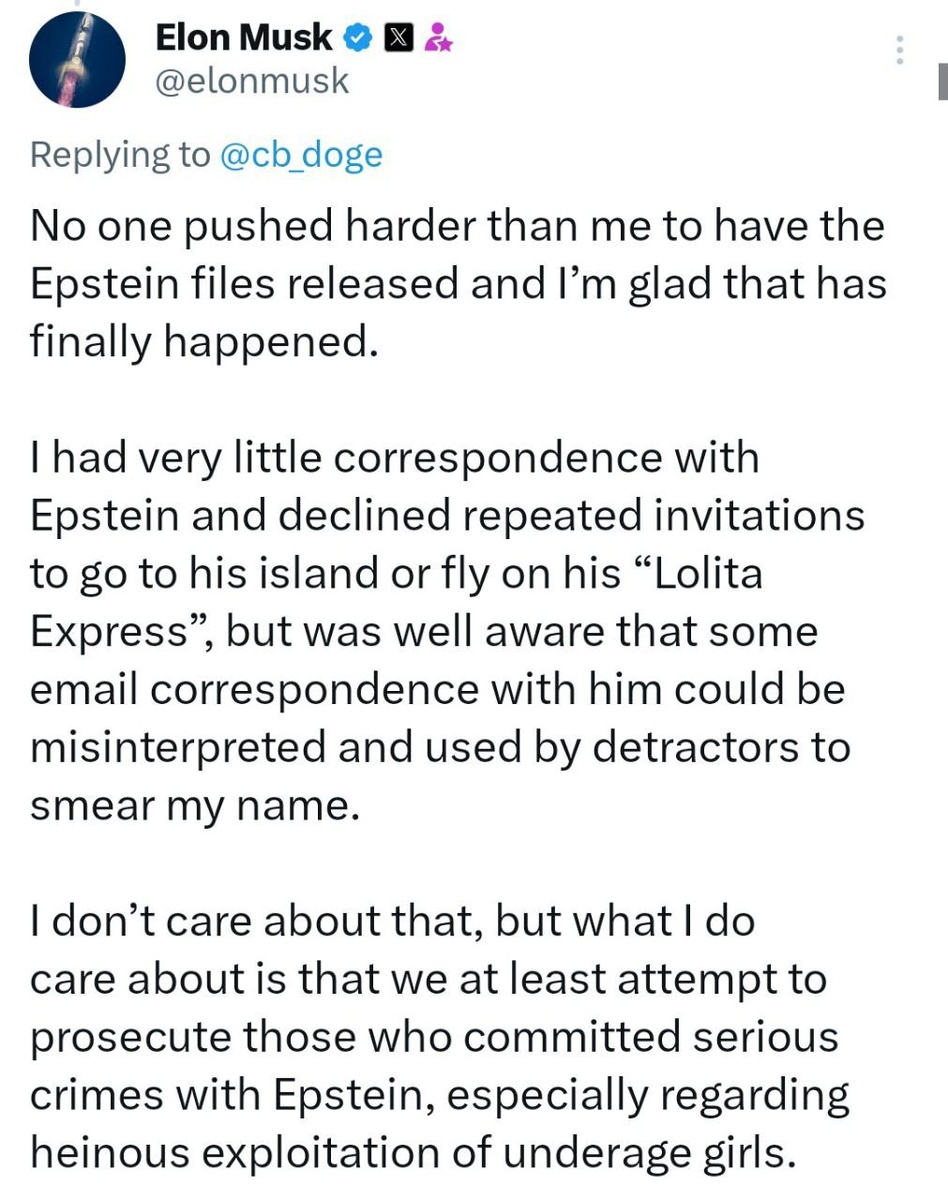 Elon 'declined REPEATED invitations' to Epstein Island and 'Lolita Express' 'Aware that some email correspondence with him could be misinterpreted' MUST 'attempt to prosecute those who committed serious crimes with Epstein'