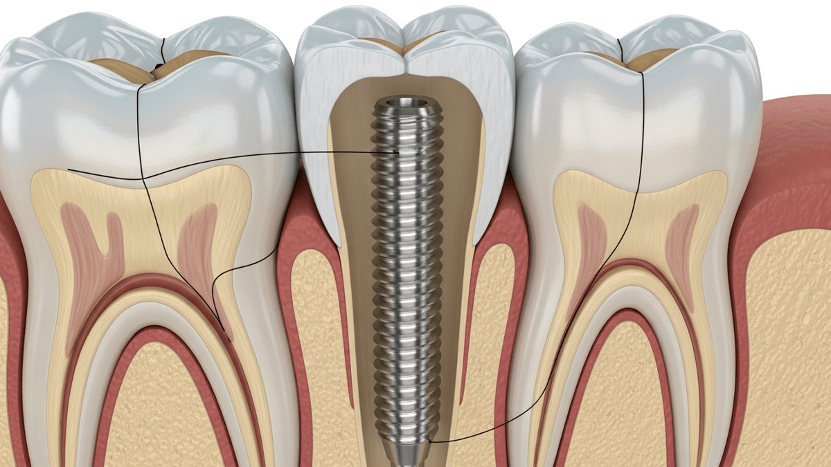 Анкерный штифт — это металлический стержень (обычно из титана или нержавеющей стали), который вкручивают в корень зуба как саморез. Зачем? Чтобы укрепить зуб, из которого удалили нерв. Такой зуб стоматологи называют депульпированным — то есть «мёртвым», без кровоснабжения и чувствительности.