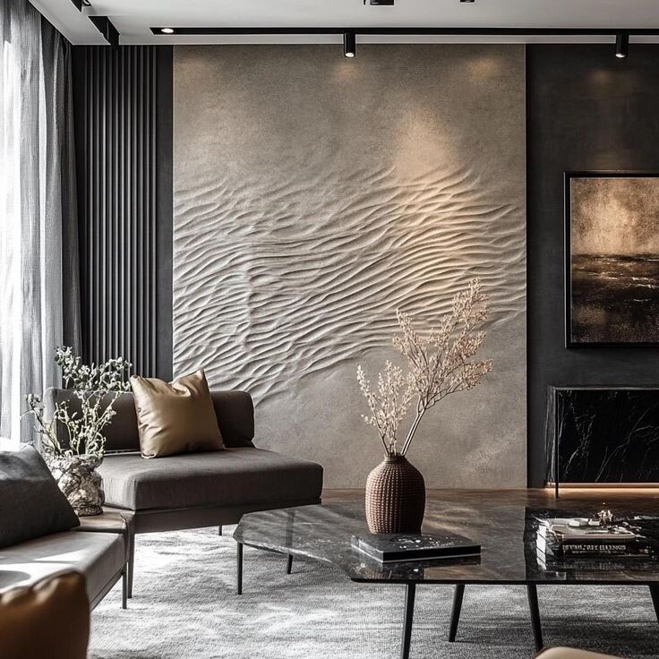 Текстурные панели и рейки: Деревянные рейки или гипсовые 3D-панели добавляют интерьеру ритм. Они создают игру теней, которая делает комнату динамичной.