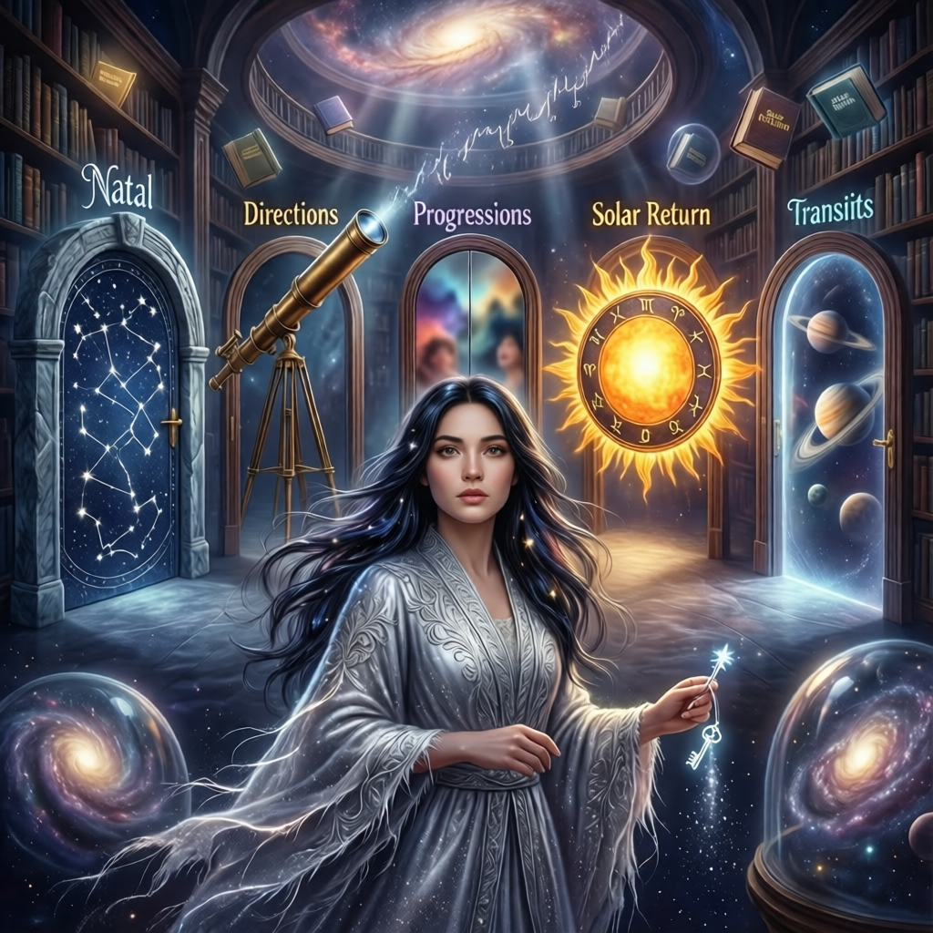 Натальная карта, дирекции, прогрессии, соляр, транзиты. Разбираем 5 главных методов астрологического прогноза простыми словами: что предсказывает каждый, их сроки и цели — от глобальных событий до внутренних состояний. 🌟 Методы прогноза в астрологии 🌟 Существует множество способов прогнозировать будущее. Расскажу о базовых традиционных методах — тех, что лежат в основе астрологического анализа: 1. Сам гороскоп (та самая Натальная карта) — то, что прописано там, — самый жёсткий сценарий на всю жизнь, это база. 🧬
