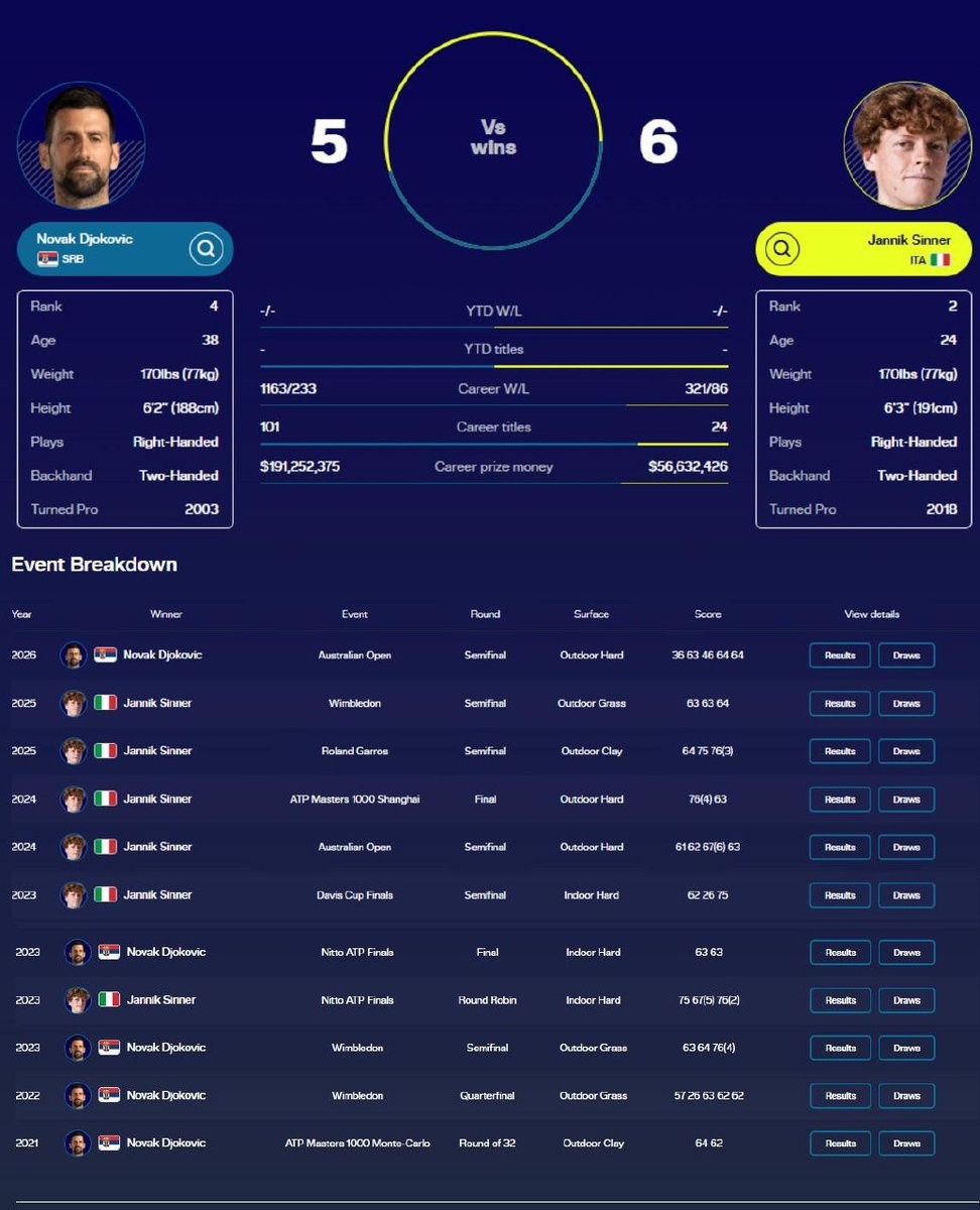 ⚡ История личных встреч Джоковича и Синнера 🎾