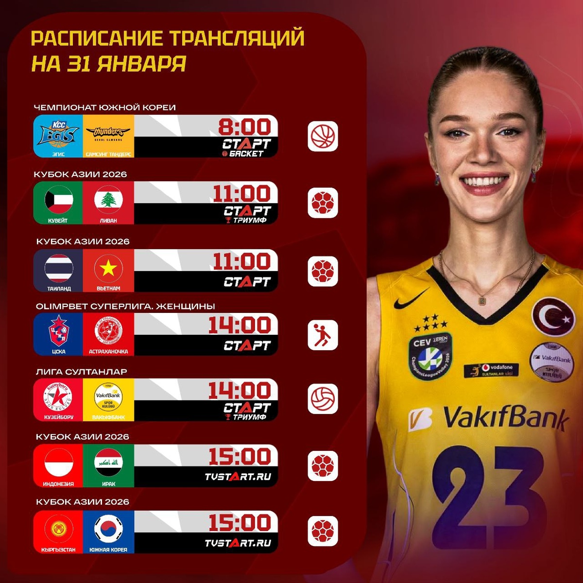 ! Начинаем с корейского баскетбола. Далее третий тур футзального Кубка Азии, волейбольная Лига Султанлар, гонки и пару матчей Эредивизи. Единая Лига ВТБ и европейский баскет тоже на месте. Оставайтесь весь день на TVSTART.RU 🖥 Подписывайся на ТВ СТАРТ в MAX📲