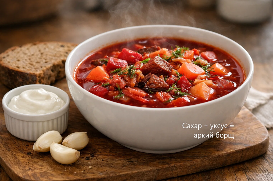 И вот тут на сцену выходит сахар. Его задача — не сделать борщ сладким, а сбалансировать кислоту, смягчить её воздействие на вкусовые рецепторы. Это базовый принцип кулинарии, который используется повсеместно: в маринадах, соусах, заправках для салатов.