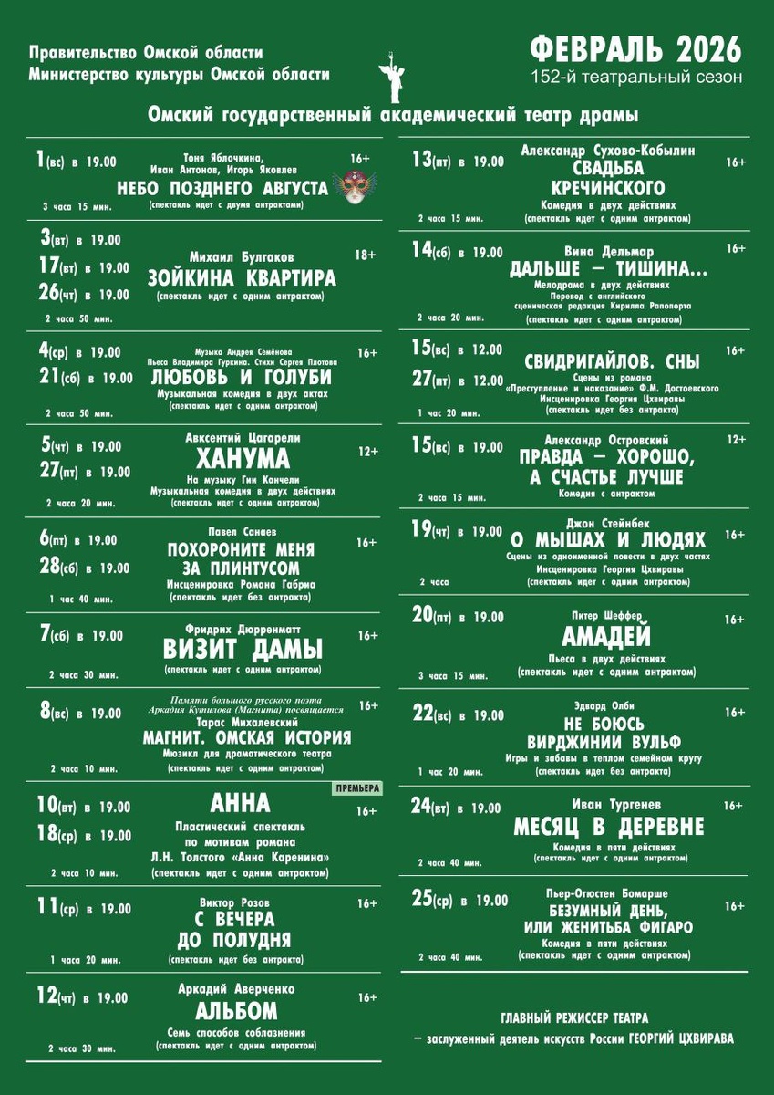 ! Наступает последний месяц зимы, и мы еще раз публикуем для вас февральский репертуар! Спектакли Основной сцены и Камерной сцены имени Татьяны Ожиговой каждый вечер ждут своего зрителя. Билеты в кассе театра и на сайте omskdrama.ru. #ОмскКультурнаястолица2026