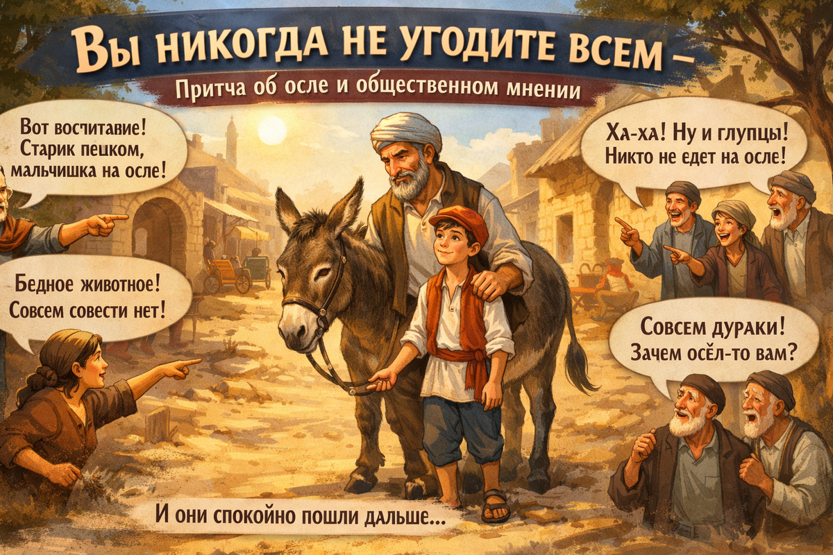 В полуденную жару по узкой пыльной улочке города медленно шли трое: отец, сын и осёл. Отец ехал верхом, а мальчик, вытирая пот со лба, вел животное за уздечку. — Бедный ребёнок… — покачал головой прохожий. — Маленькие ножки еле двигаются, а отец удобно устроился сверху. Совесть-то есть? Слова больно ударили отца в сердце. Он тут же слез с осла и посадил сына. Не прошли они и квартала, как навстречу попался другой человек. — Вот это воспитание! — фыркнул он. — Юнец расселся, как падишах, а старик плетётся пешком! Мальчик покраснел и упросил отца сесть с ним вместе. Они проехали ещё немного — и раздался возмущённый крик женщины: — Совсем бессовестные! Осёл вам что, топчан? Спина у бедного животного уже прогнулась! Отец и сын молча слезли. Теперь они просто шли рядом с ослом. И тут же услышали смех: — Ну и глупцы! Осёл есть, а никто на нём не едет. Зачем тогда он вам? Отец остановился. Погладил осла и дал ему горсть соломы, положил руку на плечо сына и тихо сказал: — Сколько людей, стольк