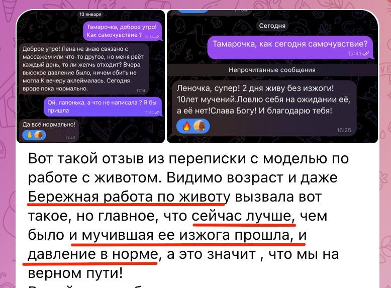 ! Я гожусь каждым своим учеником! И меня просто распирает, когда они делятся самым ценным — обратной связью от уже своих клиентов. Получил сообщение от Елены, моей ученицы на «Матрице массажа». Она работала с клиенткой по животу — бережно, по технике из шестого урока. И смогла решить проблему, которой было 10 лет. Переписка с клиенткой, скриншот 👆 13 января: «Лена не знаю связано с массажем или что-то другое, но меня рвёт каждый день, то ли желчь отходит? Вчера высокое давление было, ничем сбить не могла. К вечеру оклемалась.» 14 января: «Леночка, супер! 2 дня живу без изжоги! 10 лет мучений. Ловлю себя на ожидании её, а её нет! Слава Богу! И благодарю тебя!» 💡 Что произошло? Сначала была реакция на работу с животом: тошнота, давление поднялось. Тело выбрасывало застоявшуюся желчь. Это нормально. И Елена не испугалась такой реакции клиентки, потому знала, что так может быть. 🌸 А потом пришёл результат: ✔ Изжога, которая мучила 10 лет, прошла за 2 дня ✔ Давление пришло в норм