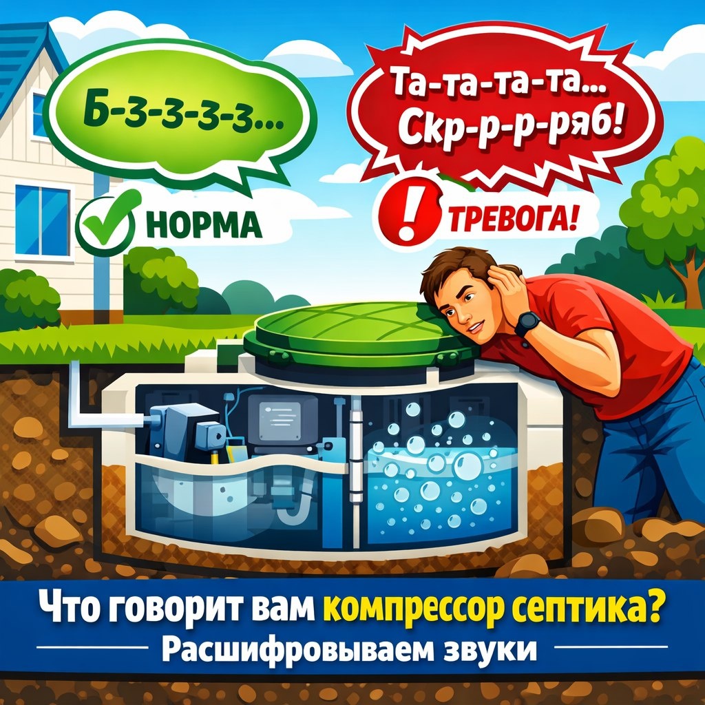 Вы установили современную станцию биоочистки (Топас, Юнилос, Астра и др.). И вот она начала «жить своей жизнью»: что-то гудит, булькает, щелкает. Первая мысль: «Сломалось!». Не паникуйте. Работающий компрессор должен шуметь. Но важно отличать здоровый рабочий гул от симптомов серьезной болезни.