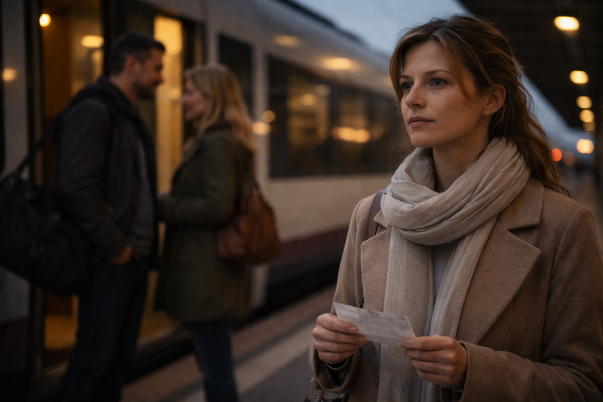 Он сказал это между делом, будто речь шла о мусоре или счёте за свет. — Дорогая, я еду к маме на неделю. Нужно помочь, — сказал он, застёгивая сумку. Она кивнула, не отрываясь от раковины. Вода шумела ровно, спокойно. Тарелка выскользнула из рук и стукнулась о дно. Не разбилась. Он этого не заметил. — Напишу, как приеду, — добавил он уже из прихожей. Дверь закрылась мягко. Слишком мягко для пустой квартиры. Жена вытерла руки полотенцем и только тогда повернулась к столу. Там лежал его телефон. Экран был тёмным, но рядом — распечатка. Тонкий лист, почти прозрачный. Билет. Она сначала не поняла, что именно её смутило. Потом увидела город. Не тот. Она не стала звонить. Не стала спрашивать. Просто сложила бумагу и положила обратно. Чайник закипел, но она не налила себе чай. Через час она стояла на вокзале. Люди проходили мимо, задевая плечами. Гул, объявления, скрип колёс. Всё было слишком обычным, чтобы казаться важным. Она увидела его сразу. Он стоял у табло, спиной к залу. В той же курт
