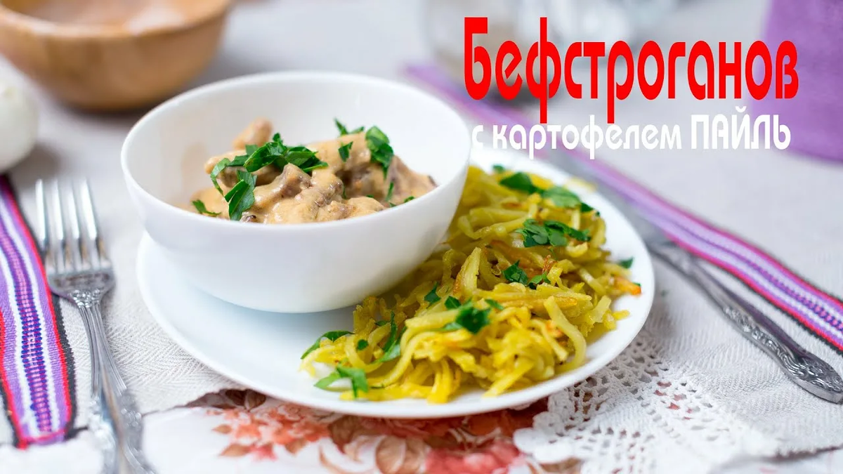 Для приготовления этого блюда нам понадобятся следующие ингредиенты:\ Для соуса мы возмём: Гарнир мы сделаем из таких ингредиентов: Мясо режем небольшими тонкими ломтиками, солим, перчим и обваливаем в муке. Лук режем и пассируем. Как только он зарумянится, к нему добавляем мясо и жарим его на сильном огне. Мясо по готовности перекладываем в соус и прогреваем 20 минут. Отдельно жарим картофель и подаём к мясу с соусом. Муку растираем с маслом, доливаем бульон, кипятим. Затем добавляем томатную пасту, сметану и горчицу. Картофель режем тонкими брусочками и обсушиваем на бумажном полотенце. В кастрюле раскаляем фритюр и жарим картошку небольшими порциями. При подаче сбрызгиваем сливочным маслом.