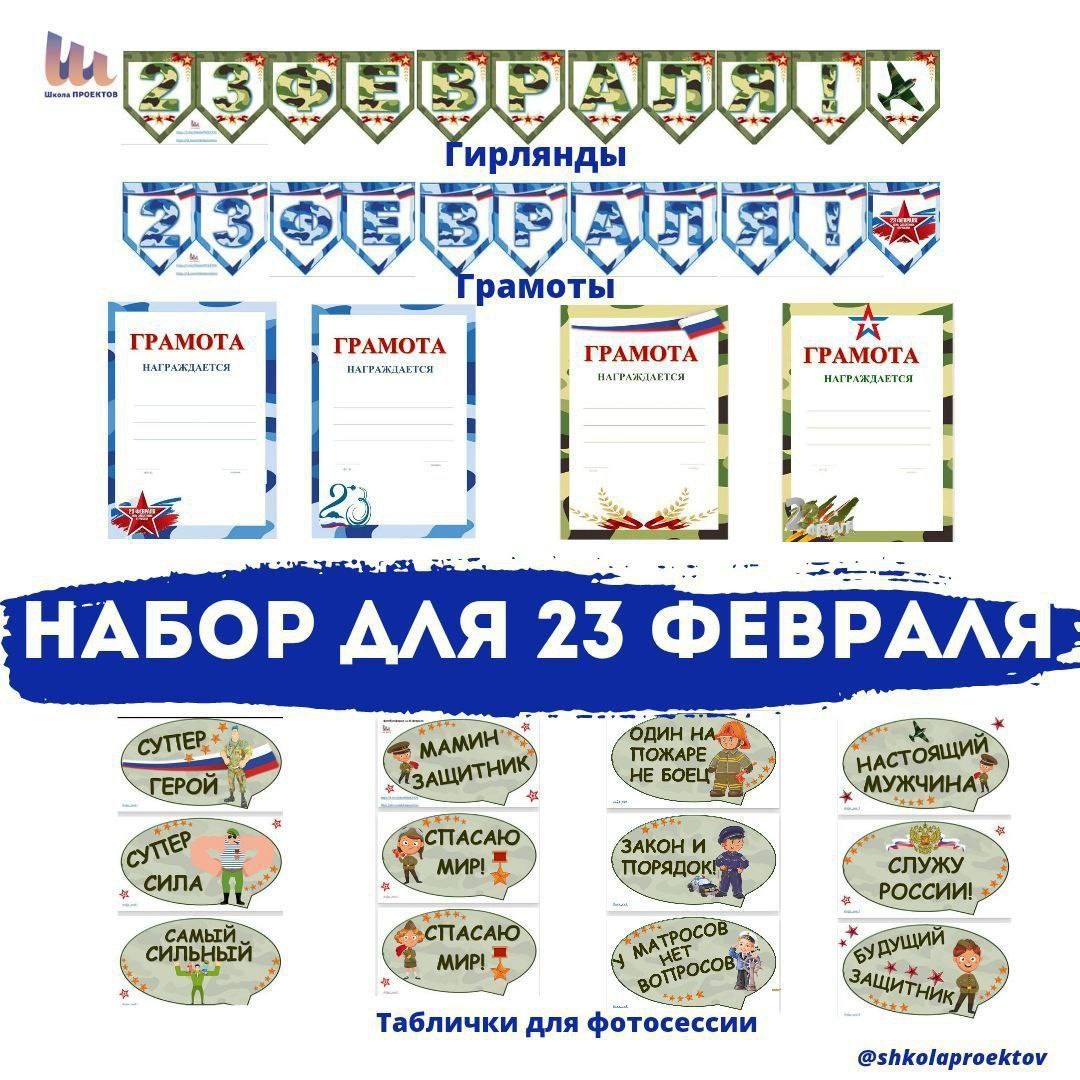 »🎖️ Скоро наступит День защитника Отечества. Но времени на подготовку к празднику совсем мало. У нас для вас есть решение– набор для праздника! Вам остаётся его распечатать, заламинировать. И вместе с детьми украсить класс. В нашем наборе: 🎖️Таблички для фотосессии — 44 шт. Милые фразы и военные атрибуты. 🎖️Гирлянда — 2 шт. (в зелёном и голубом виде) 🎖️Грамоты — 4 шт. Файлы можно редактировать. Цвета грамот сочетаются с гирляндой. 🎖️Портреты полководцев и героев с цитатами 🎁Бонусы: 🎵Собрали музыкальную папку на 23 февраля 🧸Подобрали несколько игр для конкурсов в классе на «23 февраля» 🛍Приобрести набор для организации праздника можно по ссылке: https://payform.ru/7j6hJXk/ Стоимость 150 р. Обзор папки в видео📲 ✈️✈️✈️✈️✈️✈️✈️✈️