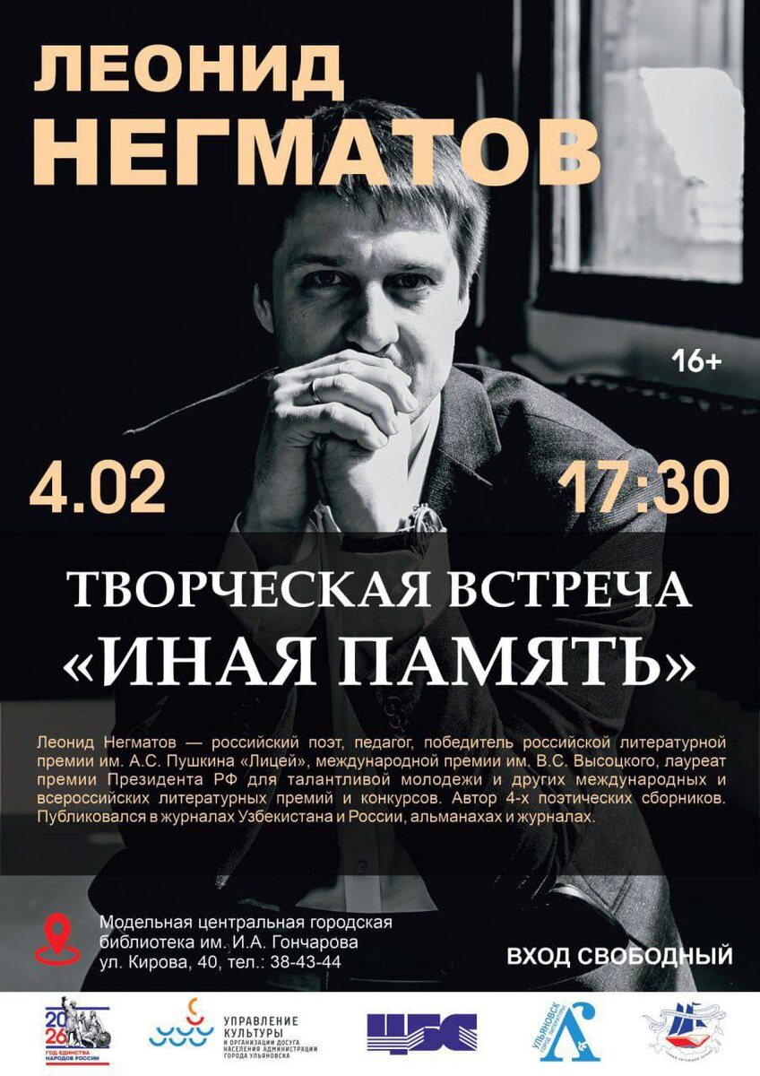 🗓️ 4 февраля в 17:30 📍библиотека им. Гончарова (Кирова, 40) Гости встречи услышат увлекательный рассказ о жизни и творчестве поэта, послушают стихи в исполнении автора, поговорят о литературе и писательском ремесле Молодые поэты смогут узнать о том, как продвигать свой талант и издавать книги, что нужно для участия во всероссийских литературных конкурсах Уникальность поэзии Леонида Негматова в том, что он творит на стыке двух культур: узбекской и русской Для справки: Леонид Негматов — победитель российской литературной премии имени Пушкина «Лицей» (2024), Международной премии имени Высоцкого, лауреат премии Президента России для талантливой молодежи 🏷️ вход свободный, 18+ #4февраля26@culturnik