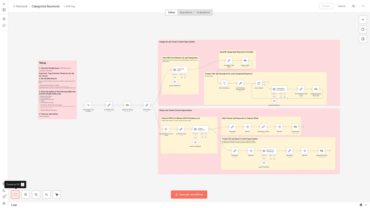 ⚡ Что делает: Автоматизация принимает ключевые слова и обрабатывает их через несколько этапов. Использует интеграцию с OpenAI для анализа и категоризации, а затем сохраняет результаты в Airtable. 👥 Кому подойдёт: Маркетологам и SEO-специалистам, желающим оптимизировать свои ключевые слова. 💡 Пример: Ключевое слово "онлайн-курсы" автоматически классифицируется как "образование" и добавляется в базу данных. 🔗 Ноды: manualTrigger, stickyNote, @n8n/n8n-nodes-langchain.agent, Airtable 📊 Сложность: Сложный #n8n #automation #nocode #aiagent #ai #aggregate ════════════════ 🎬 YouTube | ⚙️ Канал | 💬 Чат | 📮 Реклама