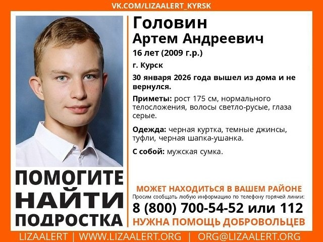 Поисковый отряд «ЛизаАлерт» объявили розыск 16-летнего Головина Артема Андреевича. Он ушел из дома вчера, 30 января, до сих пор не вернулся. - Внимание! Помогите найти подростка, - обратились поисковики в социальных сетях. Он был одет в черные джинсы и куртку. На голове – шапка ушанка. Ростом – около 175 сантиметров. Русоволосый, нормального телосложения. Информацию о мальчике можно сообщить инфоргам: Татьяна (Selena) 89250625600, Бусинка (Катерина) 89045231666.