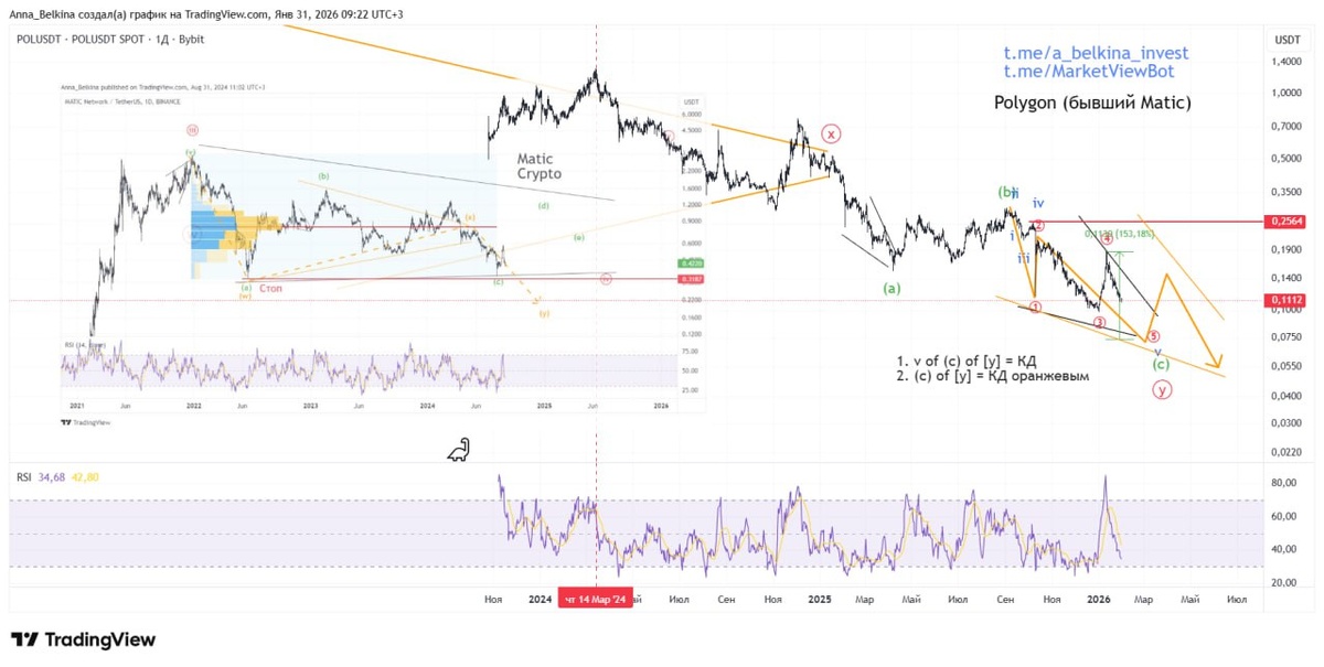 Монета продолжает оставаться слабой. Токен торгуется на 95% ниже исторического максимума: ➡️ с пиков около ~$3 (Matic) до текущих ~$0.11. Это крупное падение и в целом оно характерно для многих альткоинов после хайпа 2021. Снижение активности крупных инвесторов (whales) подтверждает менее сильный интерес. Умный капитал выбирает либо экосистему (#OP, #ARB), либо нарратив будущего (#ZK). Несмотря на падение цены, сеть по активности транзакций всё ещё используется, но не накапливается. Polygon остается действующим Layer-2 для Ethereum. Сообщество даже обсуждает возврат к тикеру #MATIC из-за путаницы и утраты узнаваемости, что может помочь восстановить интерес. По технике, продолжается снижение. Отмечаю два варианта движения после завершения волны (b) of [y]: 1. волна v of (c) of [y] = Конечная Диагональ, где ставится волна [5]. 2. волна (c) of [y] = Конечная Диагональ оранжевым, даёт большее пространство для снижения, синхронизируется с картиной на большинстве других монет, где форм