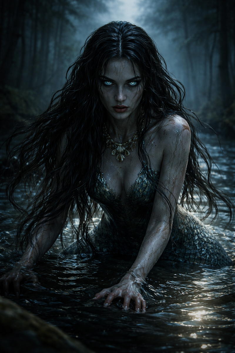 Русалки вышли из глубины — не две, не три, а целая стая. Красивые и страшные. Их тела были гибкими, гладкими, с хвостами, переливающимися серебром и тиной. Лица — разными: у одних — девичьи, у других — вытянутые, с острыми скулами и глазами без зрачков. Волосы плавали вокруг, как водоросли, цепляясь, мешая видеть.
