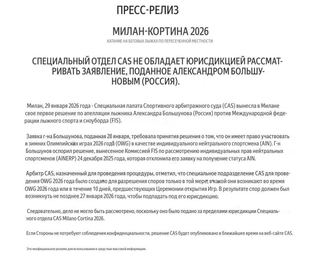 Спецкомиссия CAS вынесла первое решение по апелляции Большунова против FIS. Заявление, поданное 28 января, содержало просьбу Большунова о признании его имеющим право участвовать в зимних Олимпийских играх 2026 года в качестве нейтрального спортсмена. Господин Большунов обжаловал решение, вынесенное комиссией FIS 24 декабря 2025 года, которая отклонила его заявление о предоставлении статуса нейтрального спортсмена. Арбитр CAS, назначенный для рассмотрения дела, отметил, что специальная комиссия CAS по Олимпийским играм 2026 года была создана для разрешения споров только в той мере, в какой они возникают во время Игр 2026 года или в течение 10 дней, предшествующих церемонии открытия Игр. Следовательно, спор должен был возникнуть не позднее 27 января 2026 года, чтобы подпадать под её юрисдикцию. В результате дело не могло быть рассмотрено, поскольку оно было подано вне юрисдикции специальной комиссии CAS по Играм