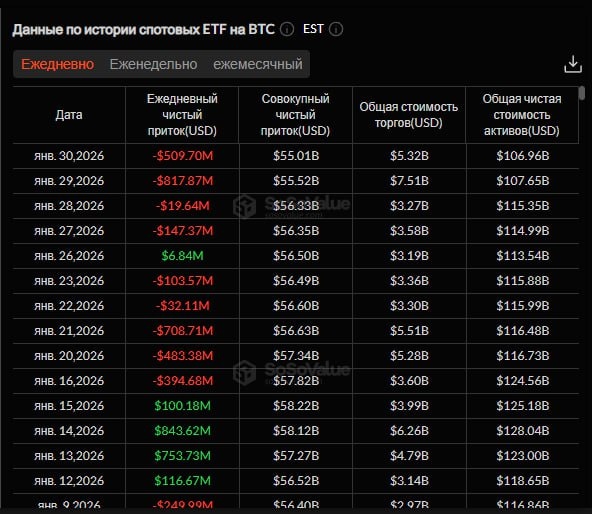 🔸30 января спотовые биткоин-ETF зафиксировали общий чистый отток в размере $509,7 млн, а спотовые ETF на эфириум получили общий чистый