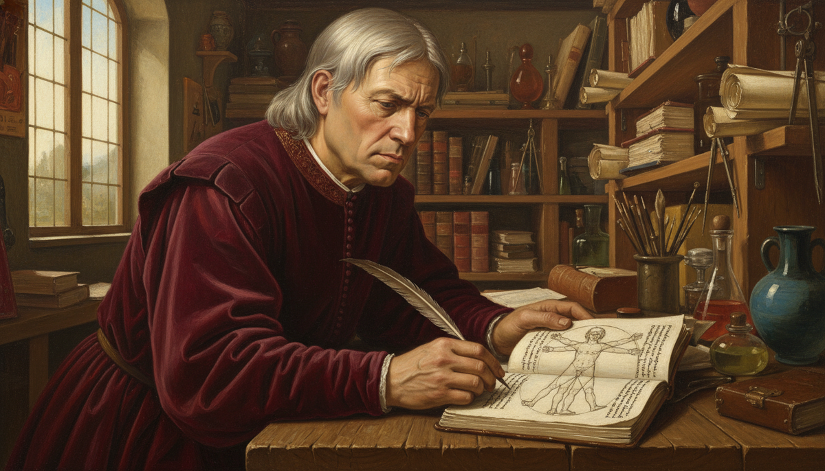 Представьте: 1492 год, флорентийская мастерская. Леонардо да Винчи склонился над листом бумаги размером чуть больше школьной тетради. Перо скрипит, чернила растекаются. Он рисует обнаженного мужчину. Дважды. В одной позе руки широко расставлены, ноги сдвинуты. В другой — руки чуть ниже, ноги расставлены. Вокруг фигуры — круг и квадрат. Леонардо не собирался никому это показывать. Это был просто эскиз для себя, затерянный среди сотен других набросков в его записной книжке. Очередное исследование того, что занимало его всю жизнь: идеальных пропорций человеческого тела. Никто не знает, кто послужил моделью. Возможно, сам художник смотрелся в зеркало и переносил на бумагу собственное отражение. Возможно, это был кто-то из учеников или знакомых. Леонардо не оставил ответа. Но он оставил текст. Выше и ниже рисунка — блоки записей, сделанных справа налево, в зеркальной манере письма, характерной для да Винчи. Первые строки отсылают к человеку, жившему полторы тысячи лет назад: «Архитектор Вет