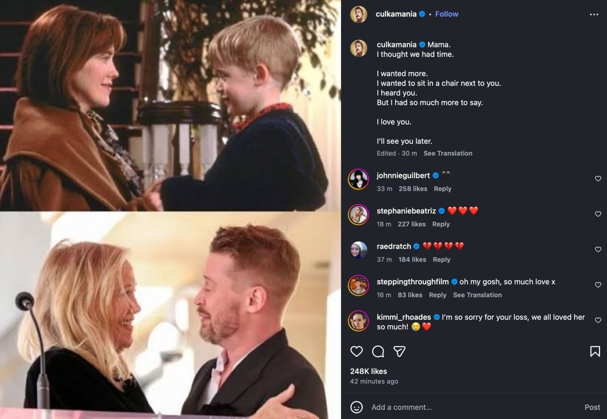 Знаменитый фильм "Один дома" и " Один дома два "сопровождает многих людей по всему миру в Рождество и Новый год. Это как старый добрый приятель. Включил фильм и встретился как будто с родней. Дальней, но родней. Фильм уже старый , хоть и вышел в 90х. И уже начался обратный отсчет Не стало исполнительницы роли мамы Кевина. Кэтрин О' Хары. Значит с нее...хотя, например, исполнители ролей бандитов уже очень пожилые актеры, старше Кэтрин. И так грустно... Нарядный, уютный семейный фильм....он дарит тепло, любовь . Бесконечно можно рассматривать и интерьеры. Они выполнены в красно- зеленой гамме. Когда зимняя предновогодняя грусть- нет ничего лучше, как включить кино. И снова и снова Кевин обороняет свой дом и снова и снова мама, раскаявшись, несется через километры к сыну...в нем много смыслов на самом то деле .И достаточно жестоких Так тепло и нежно отозвался в своем блоге на печальную новость Кевин, которого играл Макколей Калкин : " Мама. Я думал у нас есть время. Я хотел большего. Я