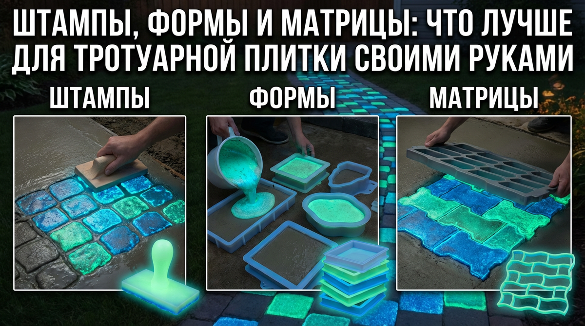 Штампы, формы и матрицы: что лучше для тротуарной плитки своими руками Давайте честно: руки чешутся сделать что-то грандиозное, чтобы двор или проект горожан радовал глаз, а не выглядел как «нам бы тут просто положить чего-нибудь». В ходу что нынче? Тротуарная плитка, конечно! Но вопрос такой — на чём лепить: штампы, формы или матрицы? Особенно когда в тренде светодиодная брусчатка и тротуарная плитка, которую видно даже ночью без прожектора. Между прочим, светящаяся плитка сегодня может быть не только на картинках журналов по ландшафтному дизайну, но и у вас под ногами. Главное — выбрать подходящий инструмент для создания этих самых модных арт объектов. Итак, разберёмся по порядку. Штампы — для тех, кто любит простоту Штамп напоминает старое доброе клише: приложил — получилось. Им хорошо создавать большие настилы, когда эстетика вторична, а скорость важнее всего. Но если хочется вычурных узоров, а не только кирпича или «под брусчатку», тут штамп сдаёт позиции. Формы — творим с