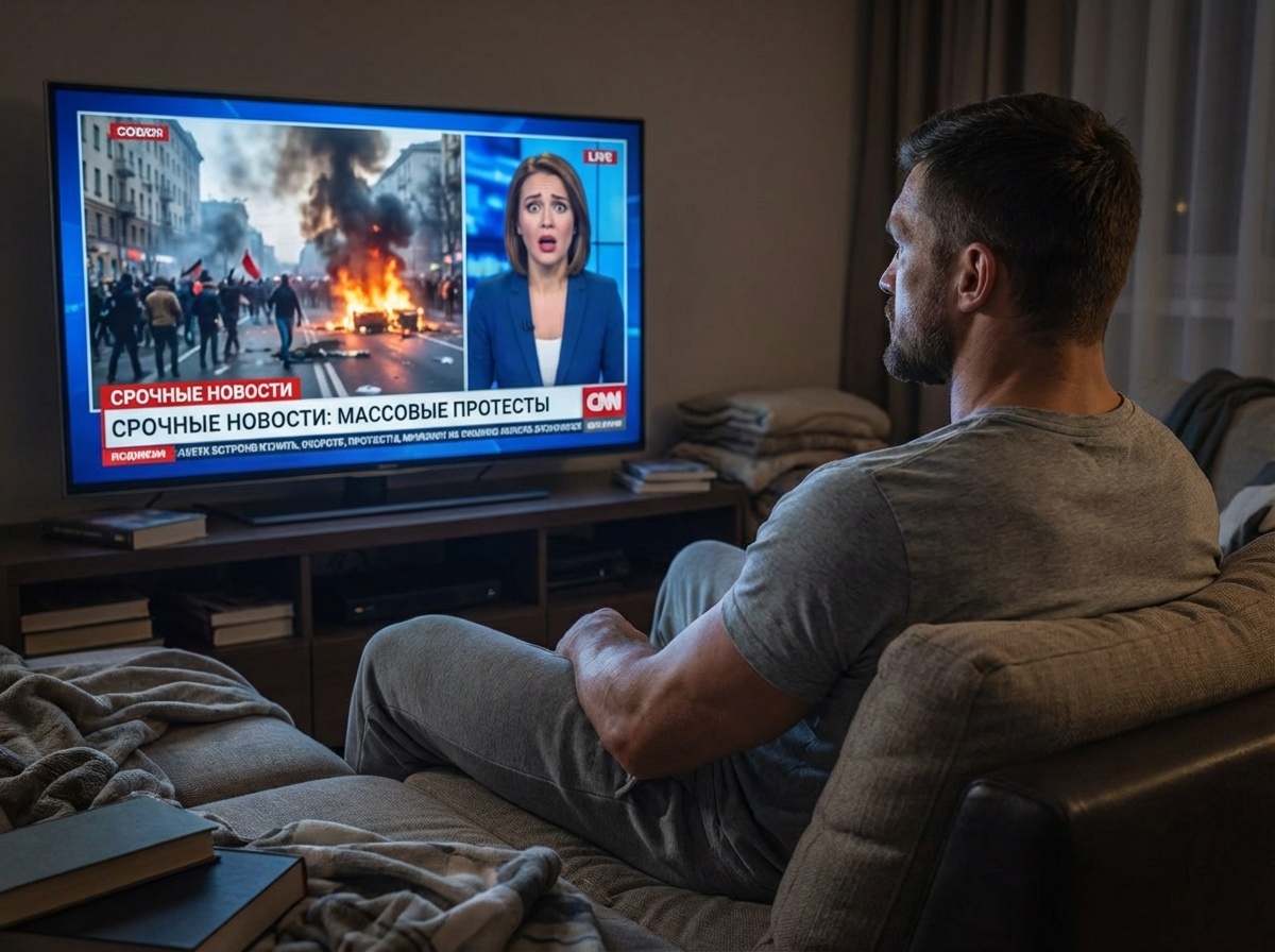 На экране беснуется толпа молодых людей с плакатами, их рты перекошены в безмолвном крике. Полицейские кордоны с трудом сдерживают толпу. Из толпы в стражей порядка летят камни и бутылки, кто-то кричит в мегафон, что-то сверкает…