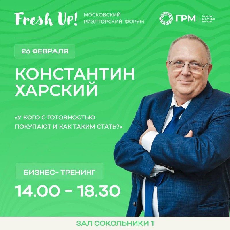 : «Почему у одних агентов покупают легко, а у других — нет?», то вам точно сюда 🔔 26 февраля на Fresh Up 2026 — Константин Харский. Консультант, тренер, писатель. Человек, который с 1992 года работает в тренинговом и консалтинговом бизнесе и знает о продажах и людях больше, чем многие из нас за всю карьеру. 📌 Тема бизнес-тренинга: «У кого с готовностью покупают и как таким стать?» Это будет разговор не про скрипты, а про мышление успешного агента: ➖ какие вопросы он себе задаёт ➖ чему придаёт значение ➖ как справляется со страхом, виной и стыдом ➖ и почему клиенты ему доверяют Константин работает с компаниями федерального уровня (РЖД, Роснефть, Почта РФ и др.), автор нескольких бизнес-книг и мастер storytelling — сложные вещи он объясняет просто, легко и с юмором. 📆 26 февраля 🕘 14:00–18:30 📍 зал Сокольники 1 Если хотите не просто продавать, а чтобы у вас покупали — это выступление пропускать нельзя. Зарегистрироваться! ⚡️Количество бесплатных билетов ограничено и доступн