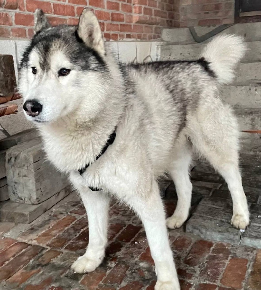 Серая Хаска, мальчик, на нём черная шлейка. Спокойный, податливый, немного пугливый.