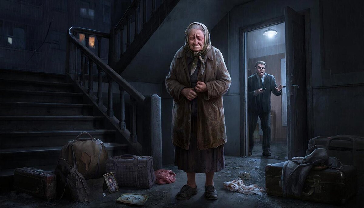 Мария Петровна стояла на лестничной площадке своей собственной квартиры, уставившись на кучу чемоданов и сумок, сваленных у двери. Её руки дрожали, а сердце колотилось так, будто хотело вырваться из груди. Это были её вещи: потрёпанное пальто, которое она надевала в далёкие 90-е, стопка выцветших фотографий с покойным мужем, любимая икона в серебряной рамке и даже та самая кастрюля, в которой она варила борщ для всей семьи. Всё это теперь валялось на холодном бетоне, как мусор.