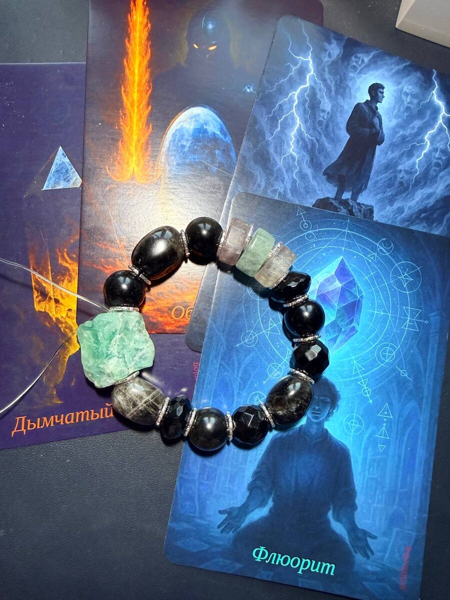 Когда мы защищены от внешнего хаоса, у нас наконец появляется ресурс услышать свой внутренний голос. Именно эту задачу решает мой новый браслет, в котором я объединила «земных стражей» и «духовного проводника». Ваша энергетическая броня: 🪨 Дымчатый кварц трансформирует отрицательную энергию в ваш личный ресурс. Весь накопленный стресс или тяжелые мысли он перерабатывает в чистую созидательную силу. 🌐 Обсидиан работает как «энергетический щит». Он поглощает агрессию, помогает избавиться от страхов и блокирует любые попытки внешнего давления на вашу психику. 💎 Чёрный агат наша «классическая броня». Он защищает от бытового негатива, сплетен и недоброжелателей, делая вашу ауру плотной и неуязвимой. Ваш духовный навигатор - Флюорит. Я использовала разные оттенки этого камня, чтобы создать многогранный поток энергии: ✔️работает на самых тонких уровнях. Он очищает ауру от ментального мусора и чужеродных программ. ✔️помогает сконцентрироваться на главном и усиливает интуицию. ✔️нужен