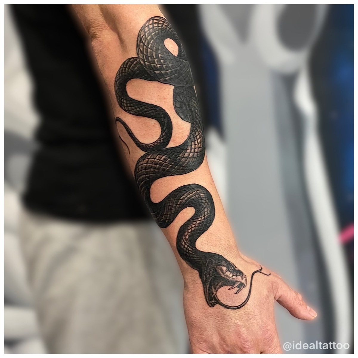 На этом фото — мощная мужская татуировка на предплечье, изображающая чёрную змею