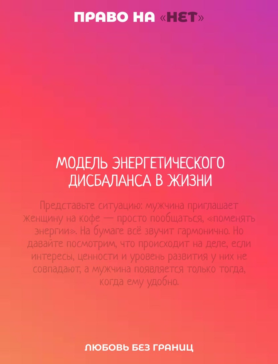Представьте ситуацию: мужчина приглашает женщину на кофе — просто пообщаться, «поменяться энергиями». Всё звучит гармонично. Но давайте посмотрим, что происходит на деле, если интересы, ценности и уровень развития у них не совпадают, а мужчина появляется только тогда, когда ему удобно. Что отдаёт женщина 1. Физические усилия и время. Ей нужно собраться: привести себя в порядок, подобрать одежду, сделать макияж. Это уже требует энергии и времени. Затем — выйти на холод, добраться до места встречи. Даже эти бытовые шаги отнимают силы. 2. Эмоциональный ресурс. Она вынуждена преодолевать внутреннее сопротивление: «А хочется ли мне вообще идти?» Подавлять раздражение или скуку, потому что темы разговора ей не близки. Держать лицо, улыбаться, поддерживать беседу, даже когда хочется зевнуть или посмотреть в телефон. 3. Внимание и терпение. Она слушает монолог мужчины, который увлечённо рассказывает о том, что важно ему, но не имеет никакого отношения к её миру. Она старается быть вежливой