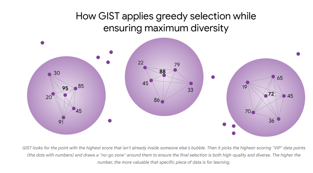 Google на днях представила новый алгоритм машинного обучения GIST, который помогает обучать модели быстрее и эффективнее, не используя весь массив данных. Алгоритм решает проблему в два этапа: Чтобы это делалось быстро и эффективно, GIST пробует разные уровни порогов разнообразия и находит лучший баланс между разнообразием и полезностью с помощью данного алгоритма. Сам процесс отбора очень быстрый по сравнению с самим обучением моделей, что делает его практичным даже для огромных наборов данных. К чему я это пишу? К тому, что описанный алгоритм как нельзя лучше ложится на принципы веб-поиска. GIST идеально ложится на реальные SEO-задачи, особенно сейчас, когда поиск и AI-ответы всё больше зависят от качества, а не количества данных. Поисковая система решает ту же самую задачу, что и GIST в ML: Из огромного массива похожих сущностей выбрать небольшое подмножество, которое даст максимальный эффект. Сущности могут быть: ключевые запросы, страницы, тексты, интенты, анкоры, доноры ссылок,