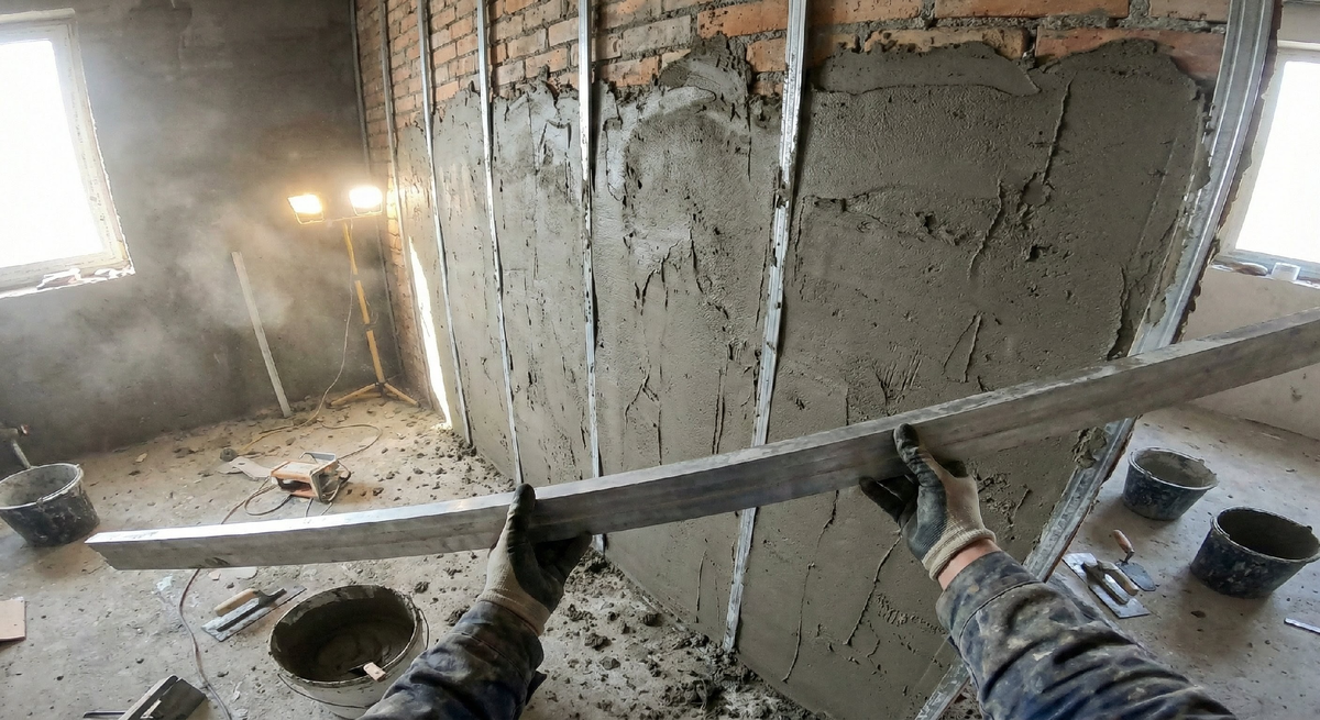 Это метод для тех, кто делает «на века» и борется за каждый сантиметр площади. Суть проста: выставляем маяки и закидываем стены смесью.