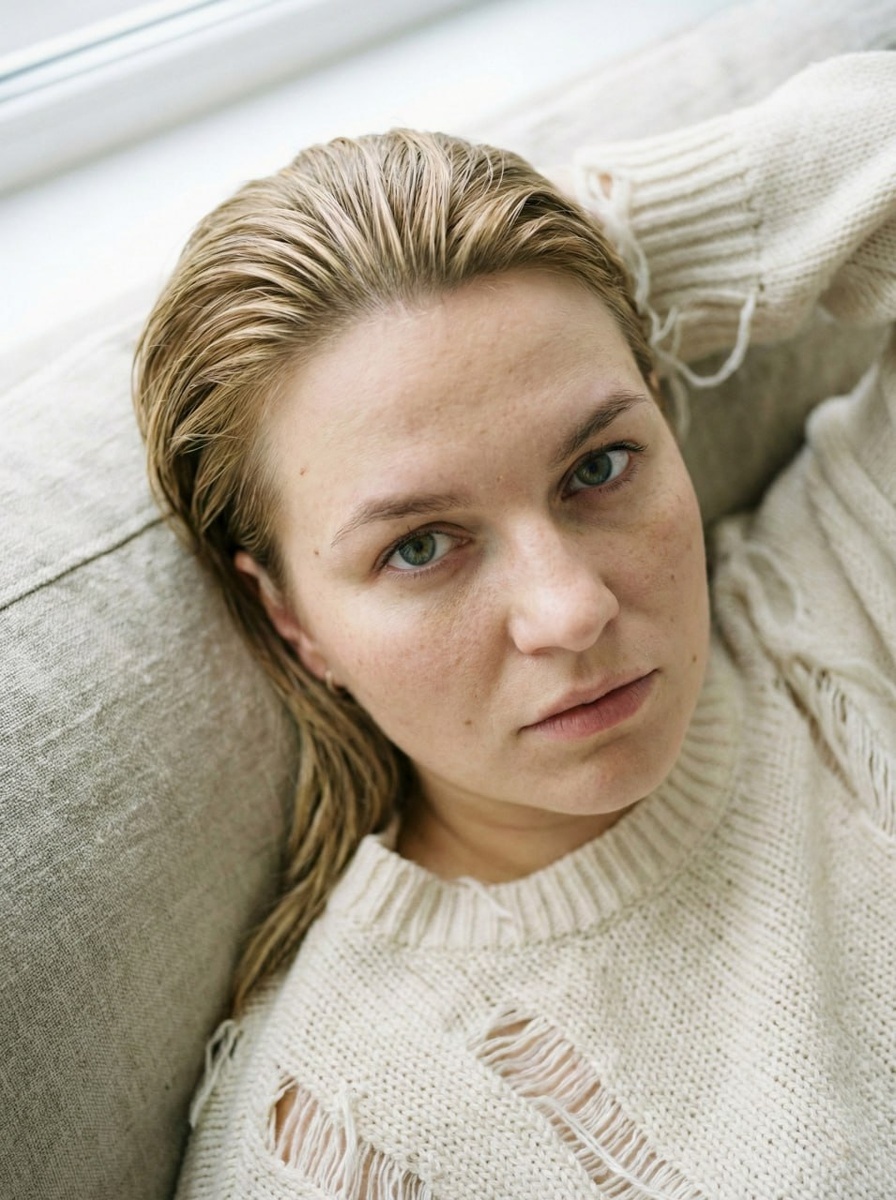 〰️〰️〰️〰️〰️〰️〰️ ✨ Серия женских снимков "Plus-size" 3 из 6 --Use the uploaded photo to reference your face and appearance. Keeping the facial features and not changing. Keep 100% similarity. --High angle portrait shot from above looking down. A gorgeous woman lying on a textured linen surface, looking intensely directly into the camera lens. "Wet look" hairstyle, very minimal raw makeup, freckles visible. She wears a deconstructed knit sweater. Soft, diffused natural light from a large window highlighting skin imperfections and eye color. Shallow depth of field. Shot on Sony A7RV with 85mm f/1.4 GM lens, highly detailed skin texture, visible pores, hyperrealistic, editorial color grading --ar 3:4 Заказать промт или фотосессию. ✉️ Телеграмм канал ⚡️ 〰️Жми на эту ссылку и примеряй готовые шаблоны! #нейросеть #aiфотосессия #промтыдляфотографа #женскийпромт