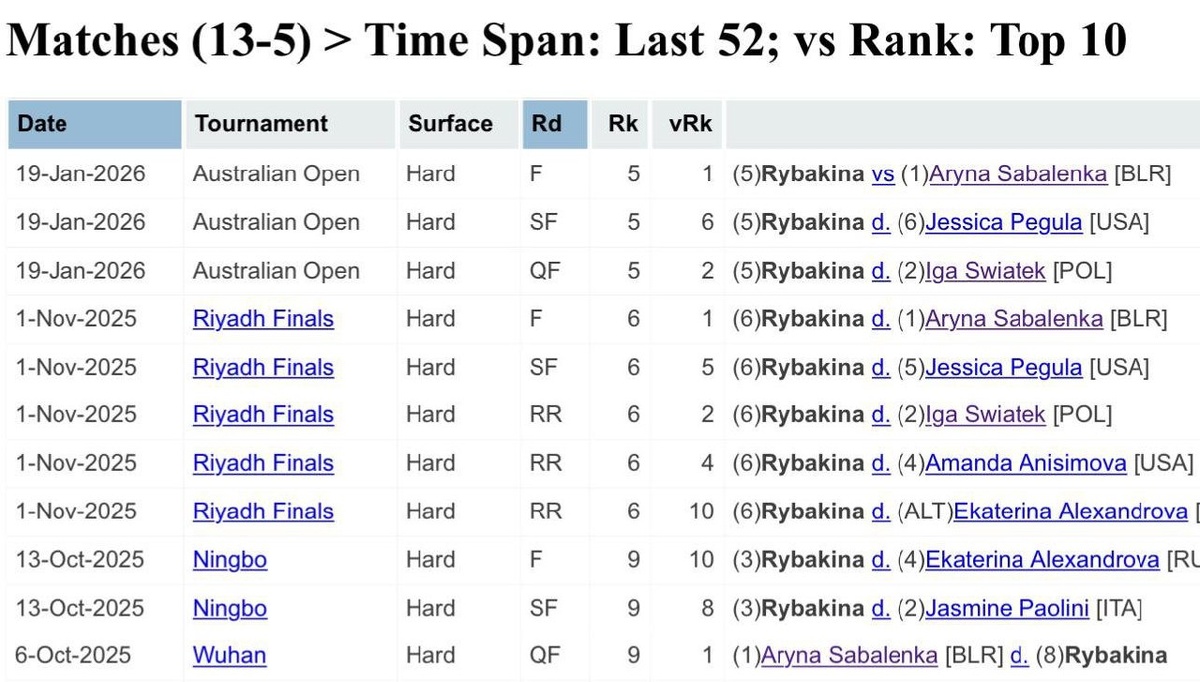 Елена Рыбакина одержала 10-ю победу подряд над соперницами из топ-10