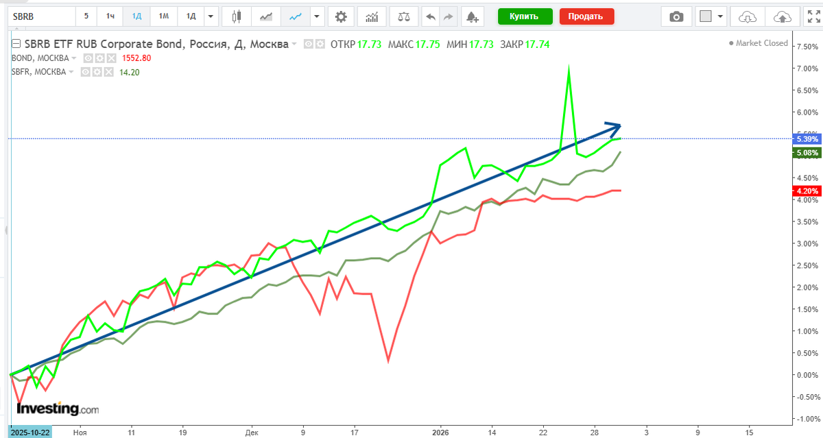 Моему ИИС сегодня 101 день: 422 897,41рупь. Что составляетв плане доходности +5,72%, а в годовых это будет 20,6%. ИИС набит корпоративными флоатерами средней категории, чуток фондов и капля акций на поиграться. Так то результат ожидаемый и ожидаемо без подвигов и чудес. Сравнение с БПИФами SBRB, BOND и SBFR: Ну да, в сравнении с SBFR +0,68% в моменте, или +2,46%гг. SBFR: "В составе фонда — ОФЗ-ПК и корпоративные облигации с переменным купоном (флоатеры) с высоким кредитным рейтингом."ц, Смартлаб. То есть тоже флотеры, как и у меня, но рейтингом примерно на 1-2 уровня выше того, чем набил свой ИИС я. В моменте +0,68% или +2,46%гг в реальных деньгах это 2,7тыр за 101 день или 9,8тыр/год. И ради таких денег я кучу времени лазал по интернету - искал "чокупить". Лучше бы валялся на диване и занимался духовным самосовершенствованием. На брокерском счете соотношение (станет через год) ещё хуже - надо будет отдать мытарям налог с купонов. SBRB: +0,3% и +1,1%гг (1.200рупь и 4,4000рупь) - п