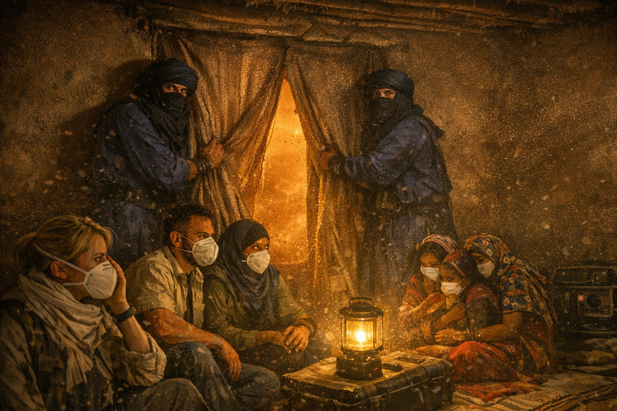 Рев бури нарастал, переходя в сплошной гул, от которого вибрировало окружающее пространство. Девушки – Зизи, Розалин и Жаклин – сидели на сложенных матрасах, спрятав лица в коленях и прижавшись друг к другу. Туареги стояли у дальней стены, прислонившись к ней, с абсолютно невозмутимыми лицами, лишь их глаза, прикрытые повязками, внимательно следили за дверным проемом. Саша возился с отключенным генератором, проверяя соединения. Свет давал один мощный фонарь на литиевой батарее, бросивший резкие тени на стены.