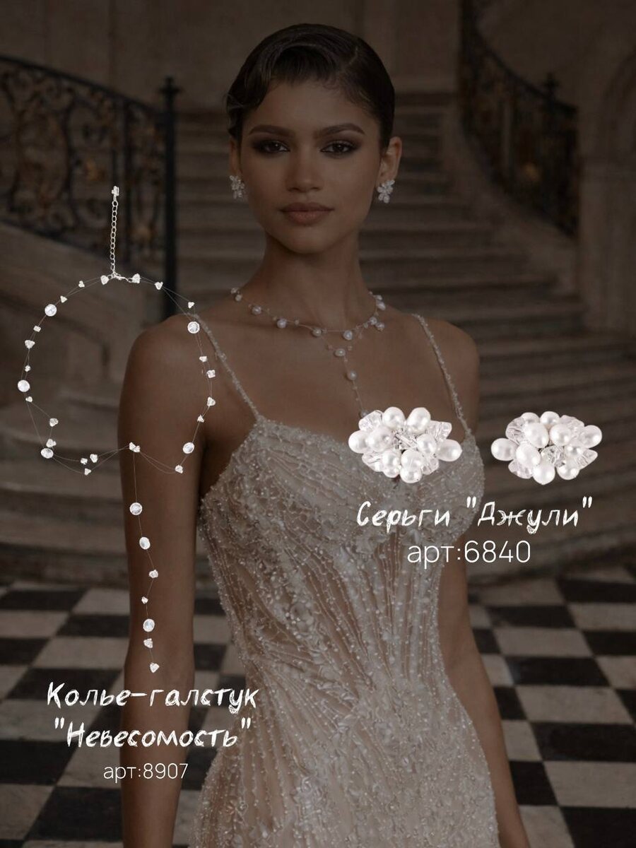 Пока весь мир гадает, каким будет этот день, мы позволили себе немного помечтать и представить образ невесты. ❤️Зендея кажется нам воплощением нежности и утончённой силы, поэтому мы выбрали для неё платье, подчёркивающее фигуру и словно окутанное мягким сиянием. В качестве украшений мы остановились на колье-галстуке из нашей коллекции «Невесомость» и серьгах «Джули»✨ Натуральный жемчуг и хрусталь деликатно отражают свет, гармонично дополняя декор платья и подчёркивая хрупкую, романтичную красоту невесты.