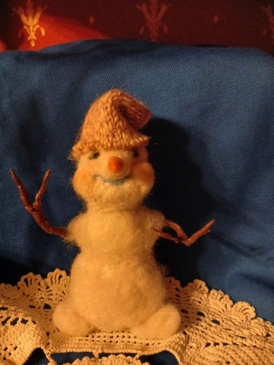 Сегодня я тороплюсь показать вам нового героя сделанного по образцу с открыток Владимира Зарубина. Не скажу, что он так уж повторяет открыточный образ. Как принято сейчас говорить" Снеговик, он и в Африке снеговик.". Хотя это весьма спорное утверждение, вы не находите? Ну, пусть будет так. Снеговики похожи друг на друга, как родные братья. На открытках разных художников этот герой практически одинаков. Единственное отличие Зарубинских снеговиков- улыбка. Иногда она широкая, иногда более сдержанная но всегда она на "лице", если так можно сказать.
