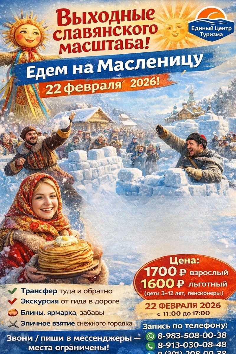 ! Едем на Масленицу в Сухобузимо — 22 февраля 2026 Где всего за один день можно: 🔥 наесться блинов до отвала ⚔️ увидеть бравых казаков 🎪 окунуться в народные гуляния ❄️ стать свидетелем эпичной битвы за снежный городок? 👉 Ответ один — Масленица в селе Сухобузимо! А мы организуем для вас поездку «под ключ» из Красноярска. 🎉 ЧТО ВАС ЖДЁТ: 🚌 Комфортабельный трансфер туда и обратно 🎤 Экскурсия от лицензированного гида по дороге 🎪 Свободное время на ярмарке: блины, сувениры, фото, забавы ⚔️ Грандиозная шоу-программа — взятие снежного городка 💰 СТОИМОСТЬ: • 1700 ₽ — взрослый • 1600 ₽ — льготный (дети 3–12 лет, пенсионеры) 📅 ТЕХНИЧЕСКИЕ ДЕТАЛИ: 🗓 22 февраля 2026 (воскресенье) ⏰ 11:00 – 17:00 🚍 В пути: 1–1,5 часа ❌ Хватит смотреть на праздник через экран ✅ Пора стать его частью! 🎯 Гарантируем: атмосферу, безопасность и отличное настроение 📲 ЗАПИСЬ И СПРАВКИ: 👉 8-983-508-00-38 (WhatsApp / Telegram / MAX) 👉 8-913-030-08-48 👉 8 (391) 208-00-38 #Масленица2026 #Сухобуз